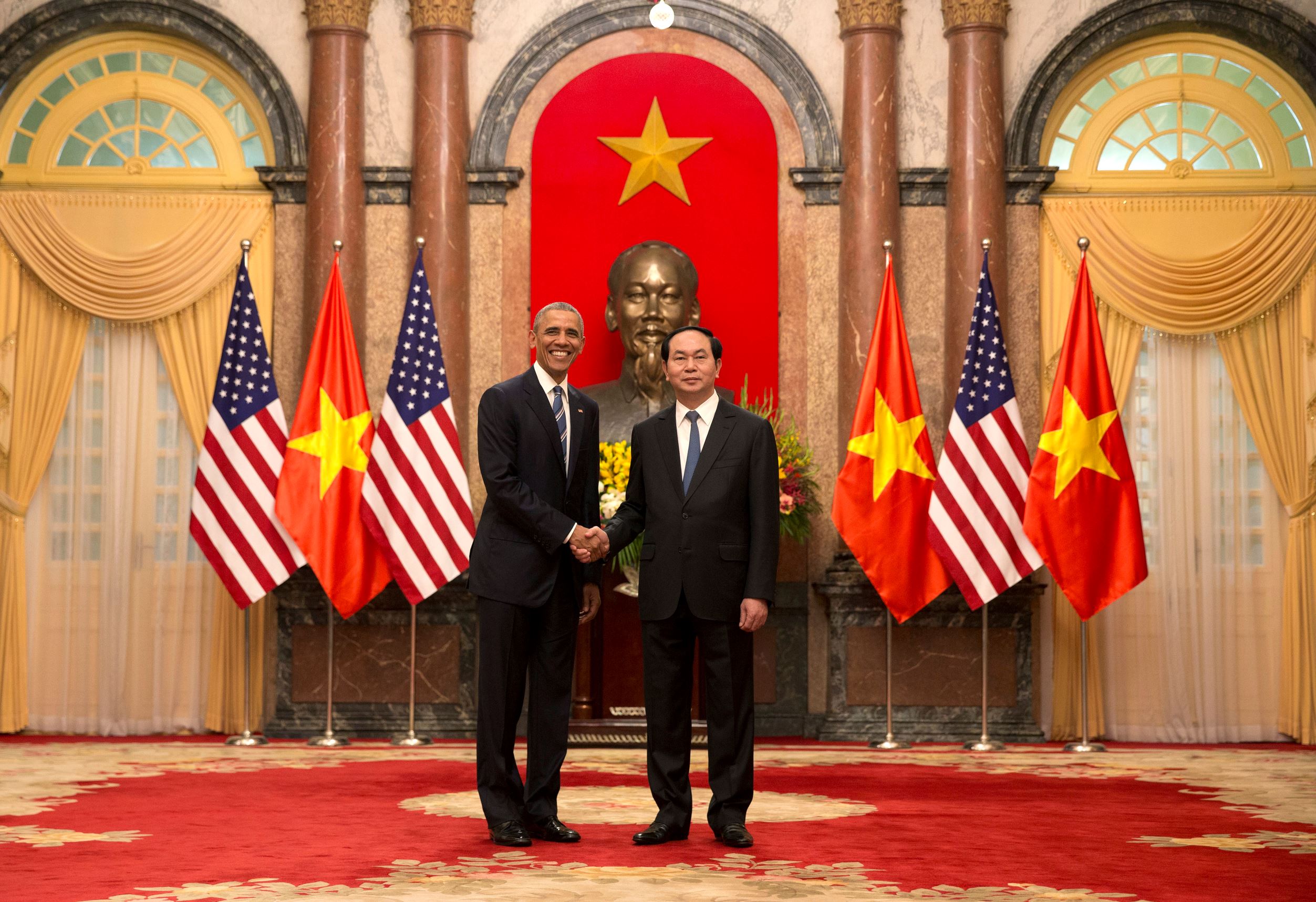 | Obama shaking hands with the Vietnam's president. |